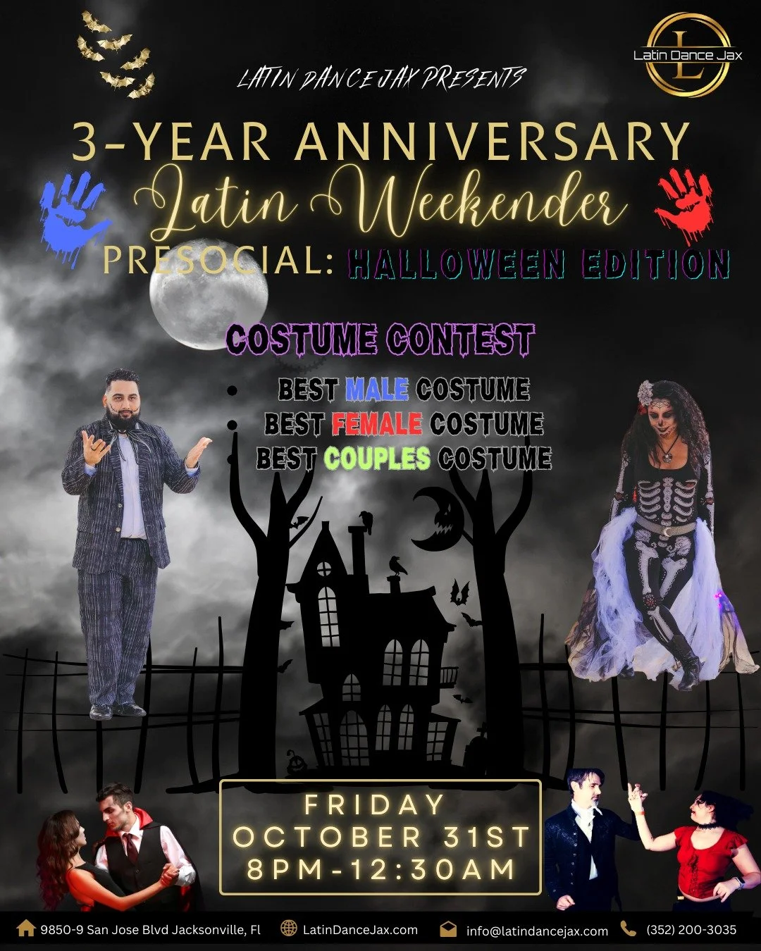 Kick off our 3-Year Anniversary Weekend with a Halloween Costume Latin Social on Friday, October 31st! 🎭 Get ready for a night of dancing, spooky fun, and prizes for the best costumes.